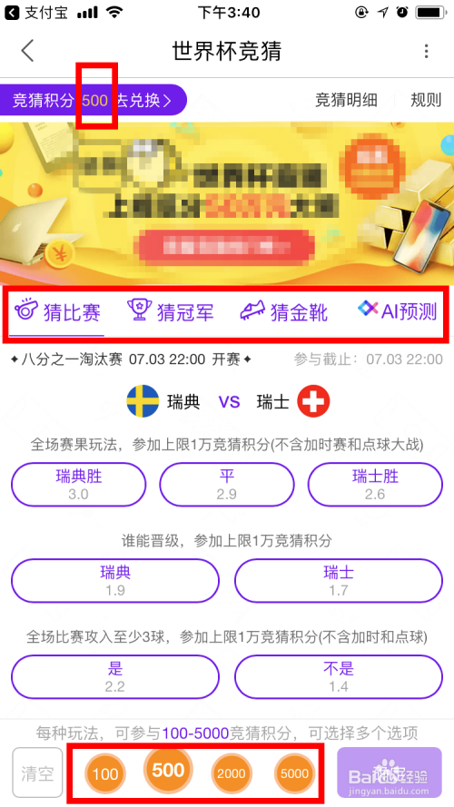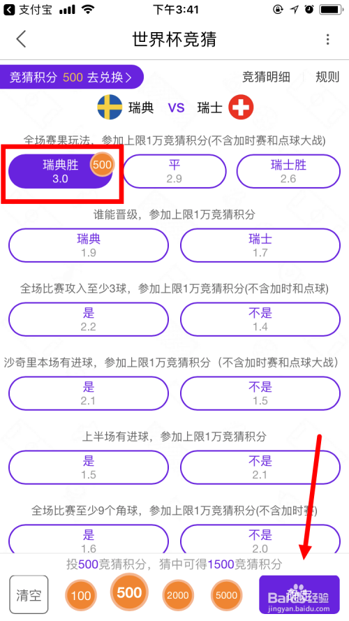 好比瑞典VS瑞士这场,小编选择瑞典赢,投注500积分,最后点击 确定 即可。