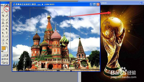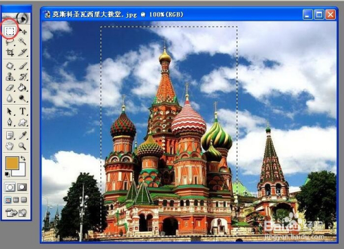 在年夜教堂图片中,点击选框东西,选出一个矩形区域。(该区域包含教堂的本家儿体部门。)