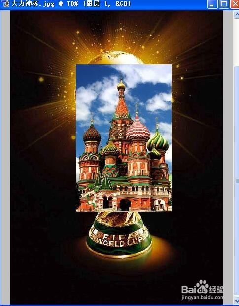 点击编纂菜单中的“自由变换”,将教堂图片,调整到合适的大小。使它可以或许笼盖鼎力神杯的本家儿体部门。如图: