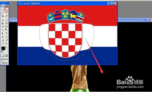 操纵东西栏中的“移动”东西,将卵形国旗区域,移动到鼎力神杯图片中。操作如图所示:
