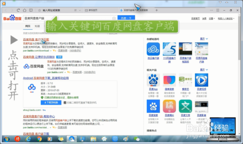 打开浏览器→输入关头词:百度网盘客户端→百度一下→点击打开第一个毗连(别点错了,不然就是网页版网盘)。