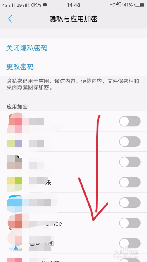 进入指纹和密码后,我们看到最底下有一个‘隐私与应用加密’,我们直接点击它。