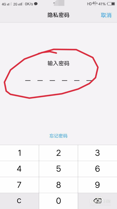 这里要注重的是,若是你之前有设置过隐私密码的话,系统会让你再次输入一个隐私密码,如果你健忘了,可以直接点击健忘密码进行验证。