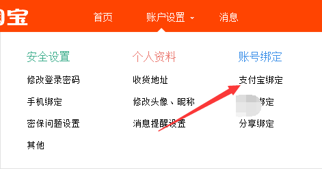 进入到我的淘宝页面,鼠标移动到账户设置,选择下拉菜单中的账号绑定>>>付出宝绑定。