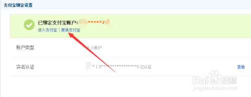 显示当前已经绑定的付出宝账户,点击下方的改换付出宝选项链接。