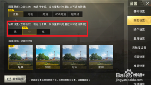 在画质设置选项中可以找到【帧数设置】,这里的帧数设置分为【低】、【中】、【高】三种,这里小编建议选择【中】,中等的帧数已经足够知足游戏的流利度了。