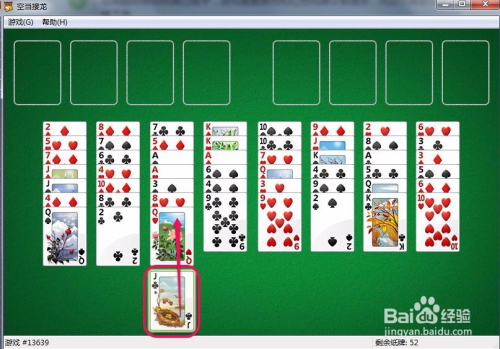 游戏需要将52张纸牌分当作4叠,从小到年夜(从A到K)按统一莳花色别离放在“收受接管区”的4个位置,就代表游戏胜利。