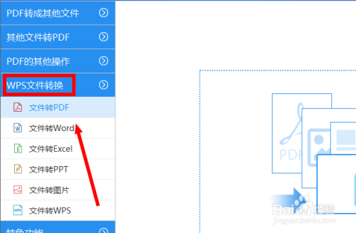 在东西左侧东西栏中找到响应操作,点击WPS文件转换下级菜单中文件转PDF