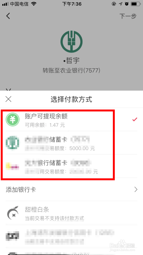 转出的账户必需是余额或者其他已绑定的借记卡,点击响应的账户进行选择。
