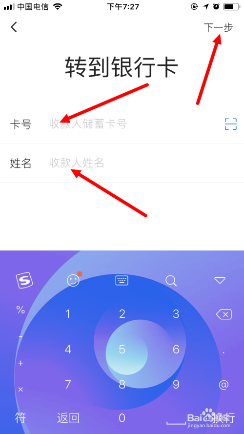 接着,输入银行卡号以及对应账户的姓名,再点击 下一步 。