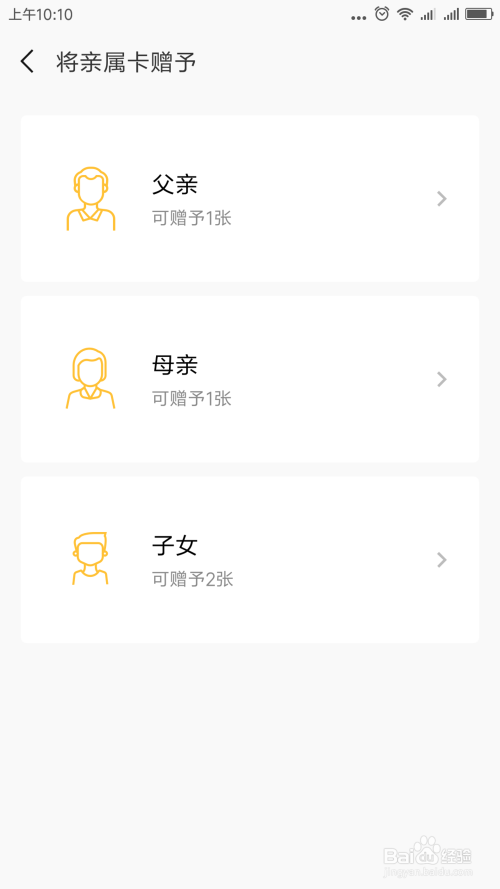 点击【赠予亲属卡】,选择将亲属卡赠予的对象,可所以怙恃或者是后代。