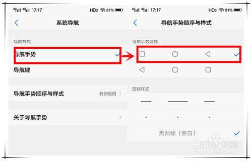 方式:依次点击【设置】——【系统导航】,勾选“导航手势”,在【导航手势挨次与样式】界面选华夏来的导航键即可。