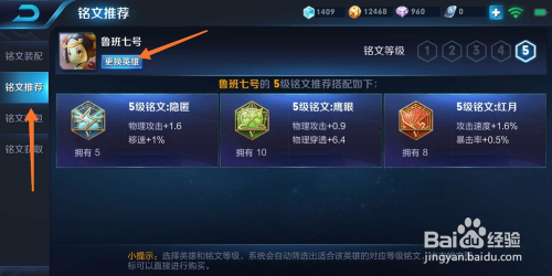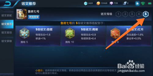 铭文保举,选择你要设置装备摆设铭文的英雄,可以改换英雄,如图,我选择的是鲁班,别的在右上角,有个铭文品级,记得点击5级,会保举鲁班七号5级铭文的搭配,可以点击采办;