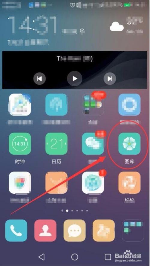 打开手机,在本家儿界面中点击打开图库选项。