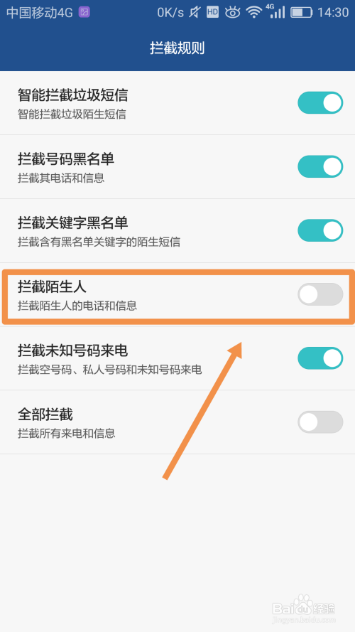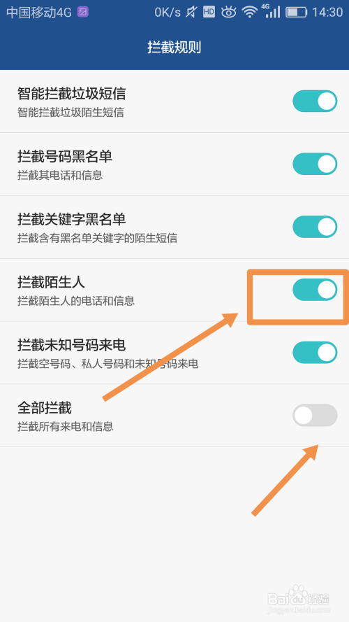 【阻挡目生人】的开关按钮开启后,手机就不会再接收到目生人的德律风和信息了,若是要阻挡所有的来电和信息,点击【全数阻挡】后面的开关按钮即可。