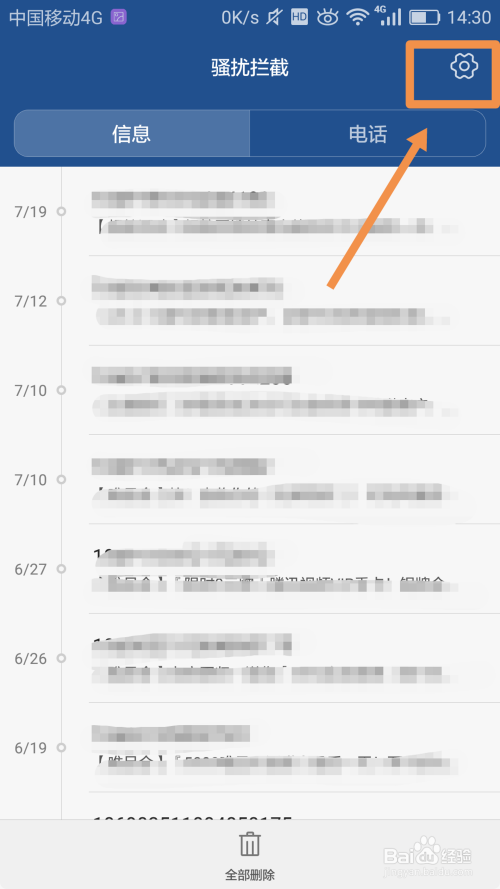 进入【骚扰阻挡】界面,找到右上角的【设置】按钮并点击,如图:
