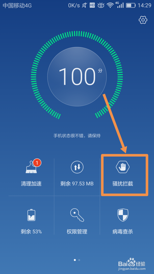 进入手机管家首页界面,找到【骚扰阻挡】并点击,如图: