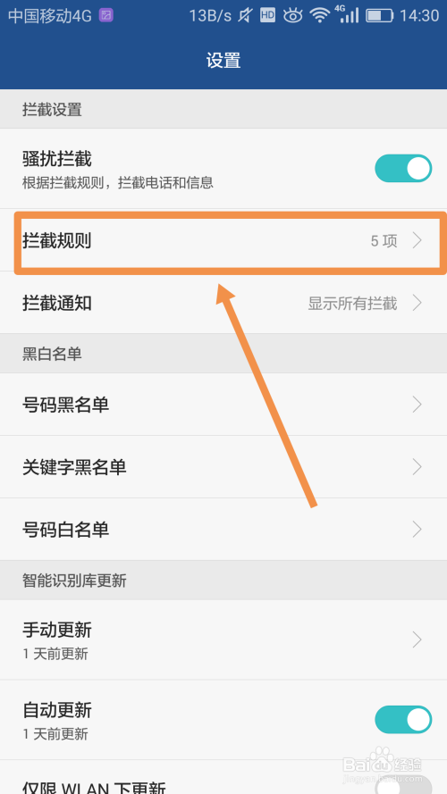 进入骚扰阻挡的【设置】界面,在【阻挡设置】栏下,找到【阻挡法则】并点击,如图: