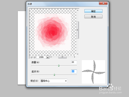 执行滤镜-扭曲-水波号令,设置数目为20,升沉为10,样式为环绕中间,点击确定按钮。