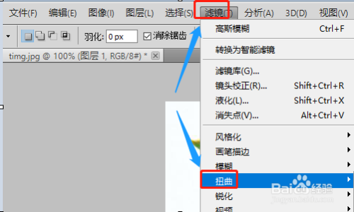 此时会在右侧看到一个新的图层,选择此图层,然后点击“滤镜”-“扭曲”,在扭曲的右侧列内外点击“球面化”;