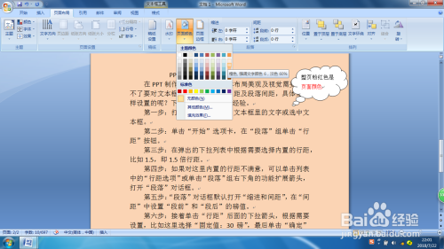 第五步:【页面颜色】在Word2007中打开文档,单击“页面结构”选项卡,在“页面布景”组中单击“页面颜色”按钮,在弹出的下拉列表中选择“本家儿题颜色”选择一种颜色,该颜色就应用到文档所有页面。若是要断根页面颜色,反复上面的操作,在“本家儿题颜色”中选择“无颜色”即可。