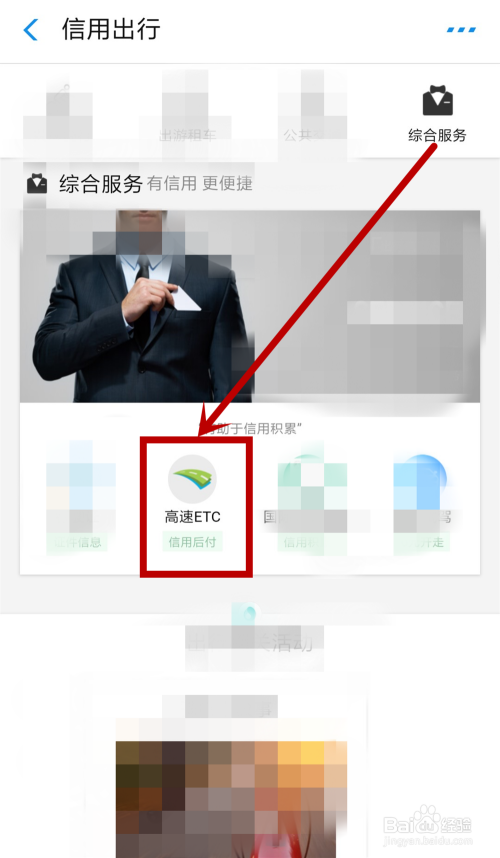 第四步,在打开的【信用出行】界面,点击【综合办事】选项,也可以下拉,找到【综合办事】组