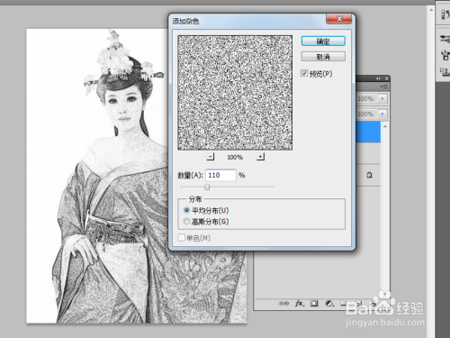 为图层1副本添加矢量蒙版,执行滤镜-杂色-添加杂色号令,设置数目为110%,勾选平均分布,点击确定。