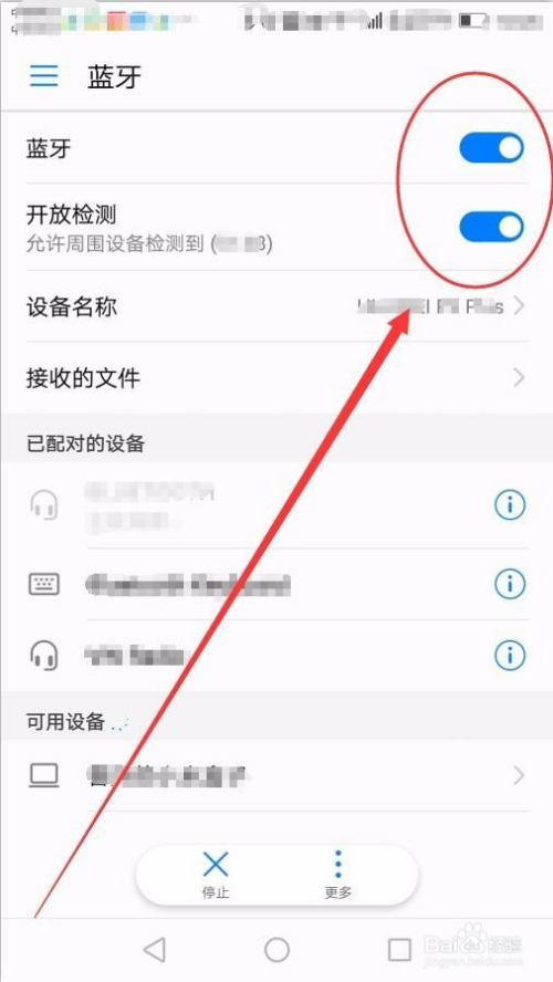 蓝牙设置窗口中,打开蓝牙选项和开放检测选项。