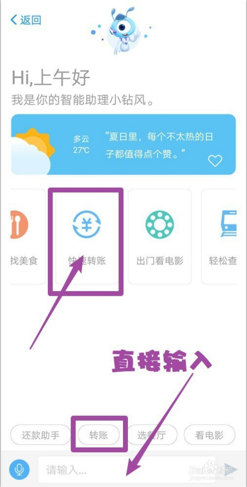 进入智能助理后,往右滑动找到【快速转账】—或下方【转账】(还可以直接输入)