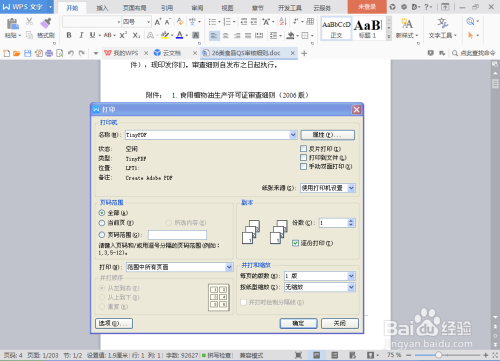 打开word文件,点击“打印”图标,弹出打印对话框,选择打印-名称:TinyPDF,点击“确定”。