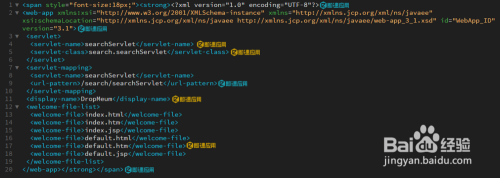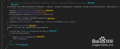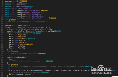 前端展示也需要精彩的后台代码去共同,后台searchServlet.Java文件如图。我们要做个假数据,模拟数据库读取。最后返回json,以流的形式写到前台,获取假数据中合适前提的值。