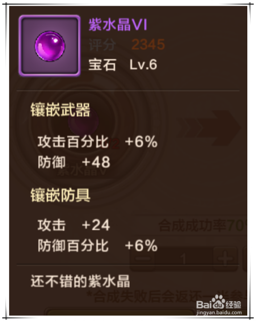 紫水晶镶嵌在兵器、防具上都可同时晋升攻防和防御属性。
