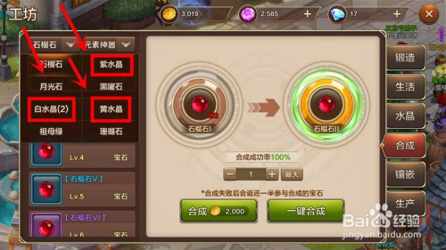 在"合当作"页面,点击左上角的"石榴石",打开材料列表下拉框;鄙人拉框中,可以看到白水晶、紫水晶、黄水晶三种材料的名称。别离点击后,可打开新页面,在此中可合当作各色水晶。