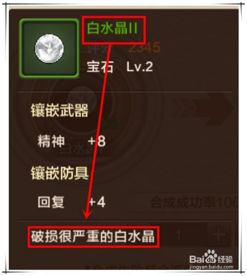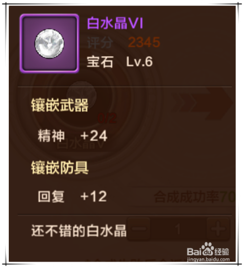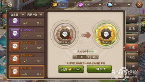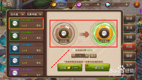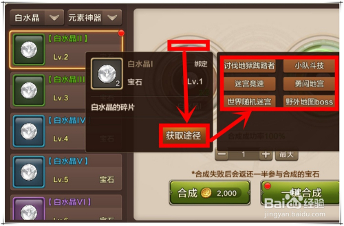 我们以白水晶为例,在白水晶合当作页面,2个白水晶I 可百分百合当作1个白水晶II,此中白水晶I 即白水晶的碎片。而白水晶II才是真正意义上的水晶。合当作水晶时,也会同时耗损失落必然的金币。
