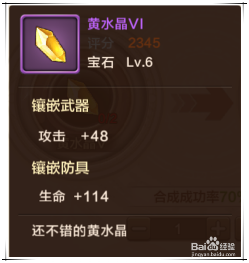 黄水晶镶嵌在兵器上可晋升进犯属性、镶嵌在防具上可晋升生命属性。