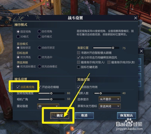 进入战斗设置,点击开启【远距离视角】,点击【确认】