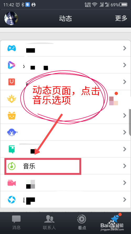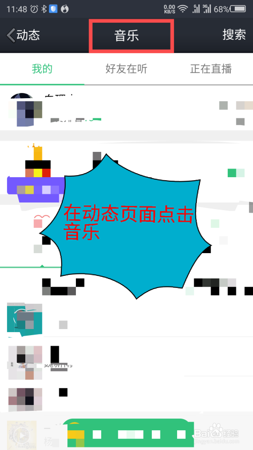 打开动态界面后,滑动屏幕能看到有个音乐选项。