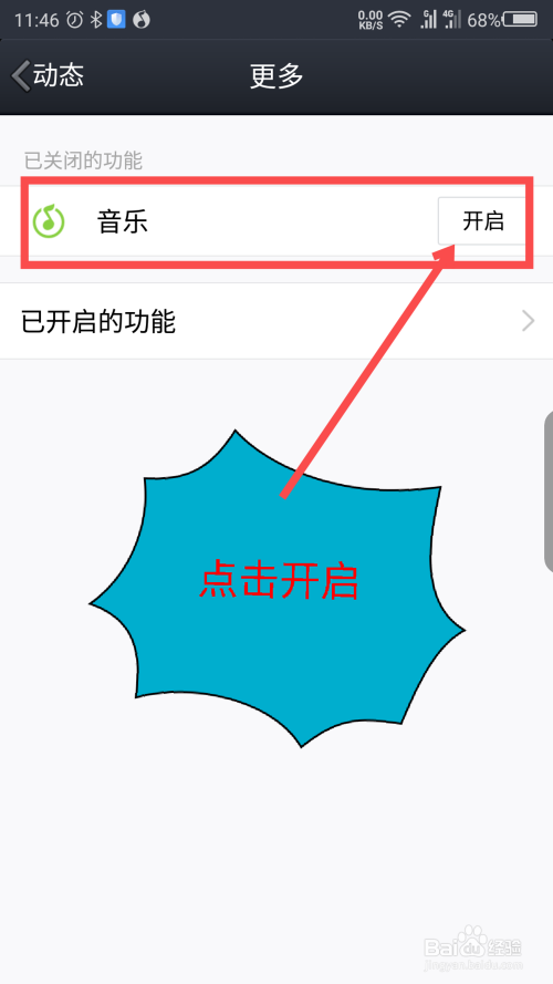 若是没有音乐选项,说你你没有开启这个功能,要先开启音乐功能。点击动态页面右上角的更多。