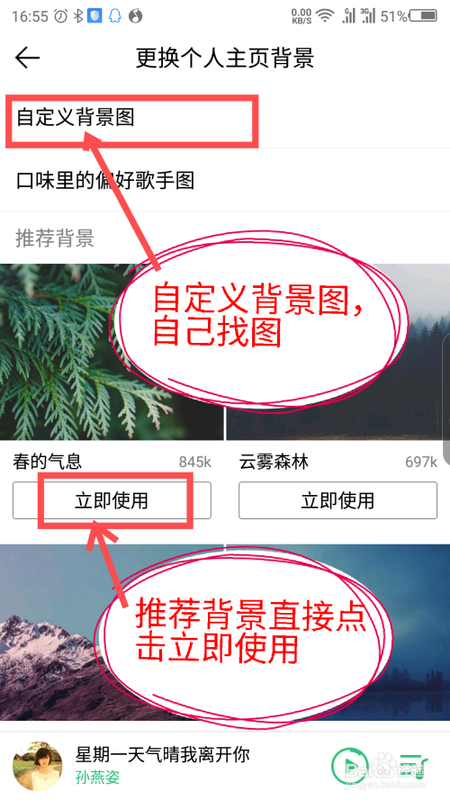 在改换小我本家儿页布景设置界面中,可以自界说布景图,也可以选择保举布景图。保举布景图,直接点击下面的当即利用,就可以改换布景了。