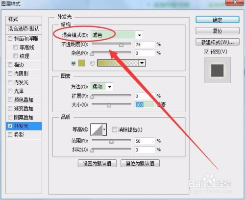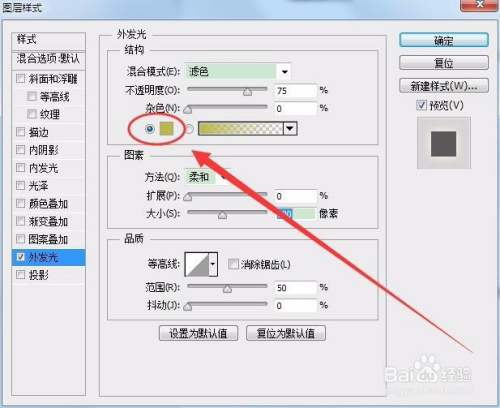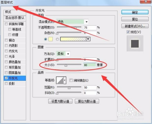 图层样式面板中,按照图形的大小更改外发光的数值,本例为80像素。