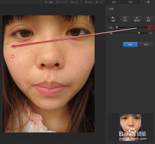 到人脸边缘处要把画笔半径调小,细心的慢慢的点击。若是呈现掉误可以点击橡皮擦擦拭回来,再从头祛斑。是否光影魔术手软件设计的很人道化。