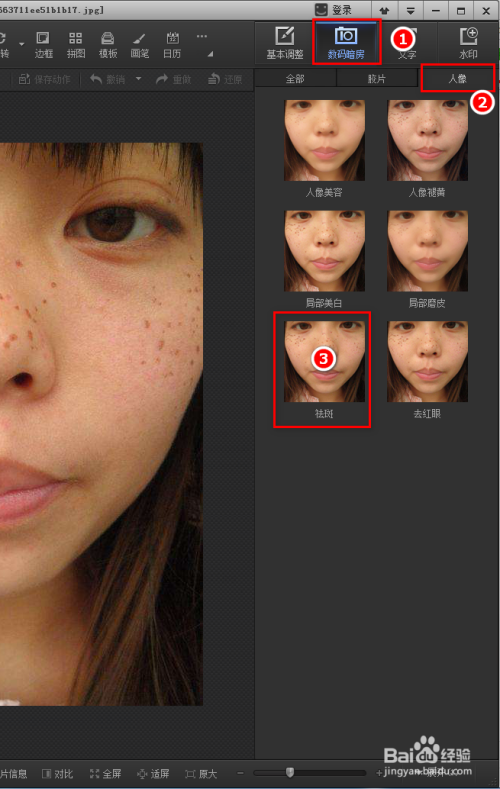 在光影魔术手软件右上角有【数码暗房】--【人像】-【祛斑】结果点击一下。