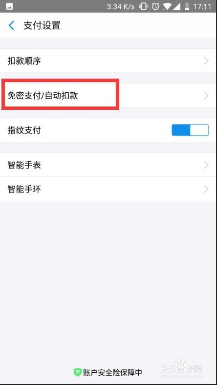 进入付出设置后我们可以看到第二个是免密付出、本家儿动扣条目,这里进入