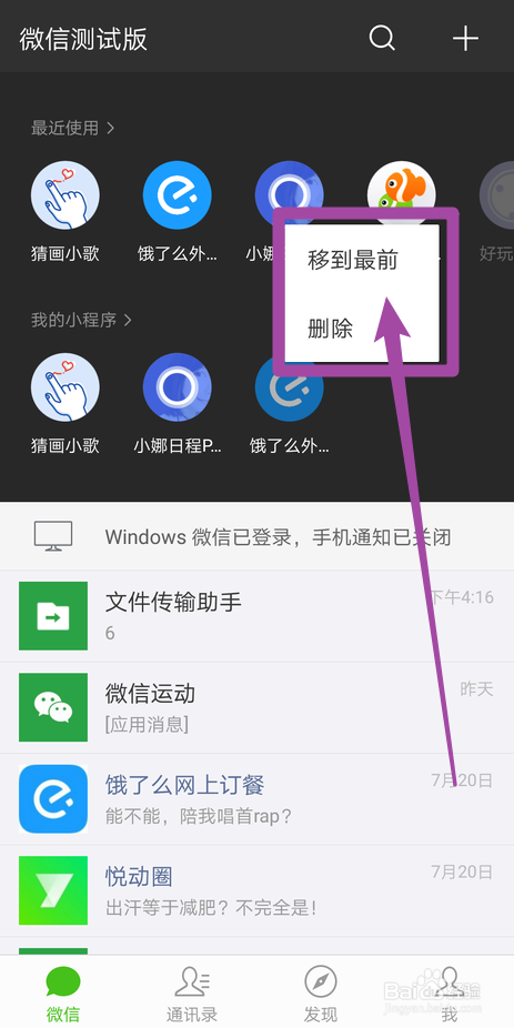 在微信首页,往下↓拉,同样可以呈现我的小法式(同样长按进行编纂)