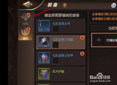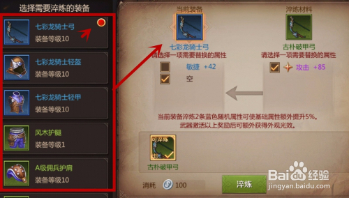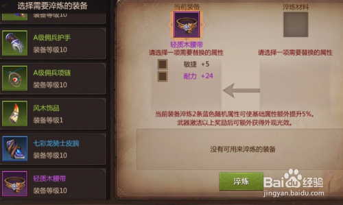 然后我们在淬炼的时辰,需要同类装备的两个分歧等第装备,有红点的装备选项,就是可以淬炼的,点击选中,如图所示。