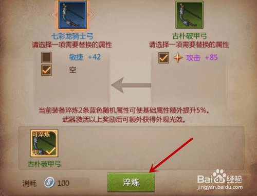 之后我们还需要耗损材料和银币,点击【淬炼】按钮,我们就能给装备碎脸当作功,如图所示。