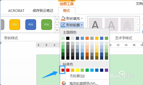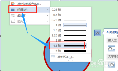 然后在空白文档处,我们按住shift键画一个正圆形出来,此时的布景颜色是蓝色的,不外不要担忧,我们经由过程点击“格局”-“外形轮廓”,给圆形的外圆部门添加一个红色的轮廓,而且在粗细里将其设置为常规的4.5磅,如下图;