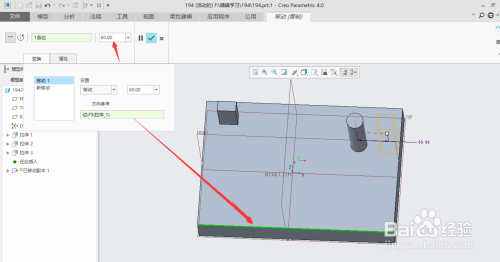 单击“移动(复制)”操控板中的”变换“按钮,单击下图标示边作为偏向参考。输入移动值(好比:60)