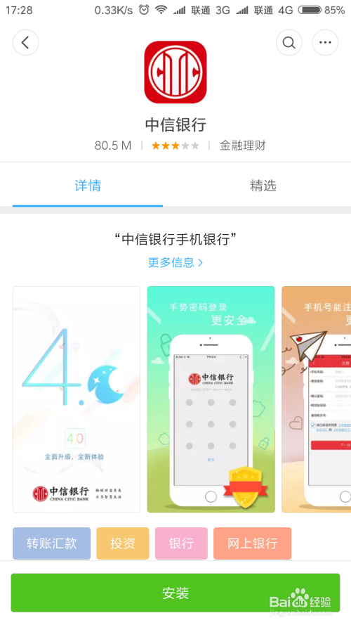 首先,进步前辈行应用下载,在手机应用商铺进行下载中信银行手机银行app,搜刮后下载安装,如图所示。