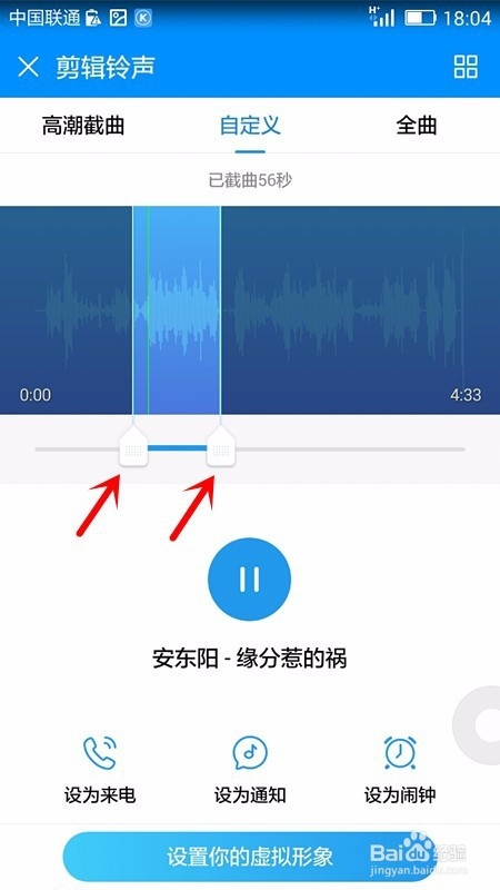 这时就会呈现剪辑铃声页面,在该页面中可以或许看到手机主动截取的歌曲,我们可以点击页面中的播放按钮来试听系统截取的歌曲部门;